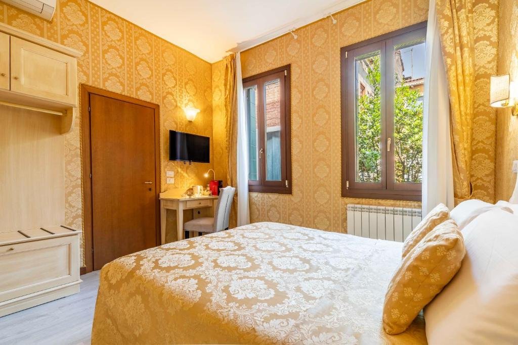 Relax in an elegantly designed double room featuring classic Venetian décor, air conditioning, and a satellite TV. Thoughtfully equipped for comfort, this inviting space provides the perfect retreat after a day of exploring the city’s historic streets and canals.